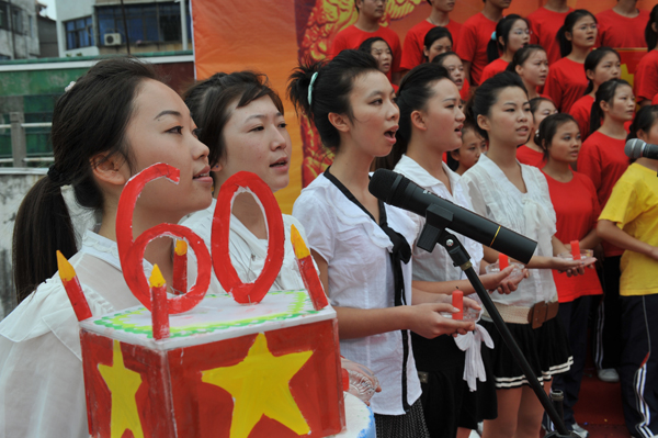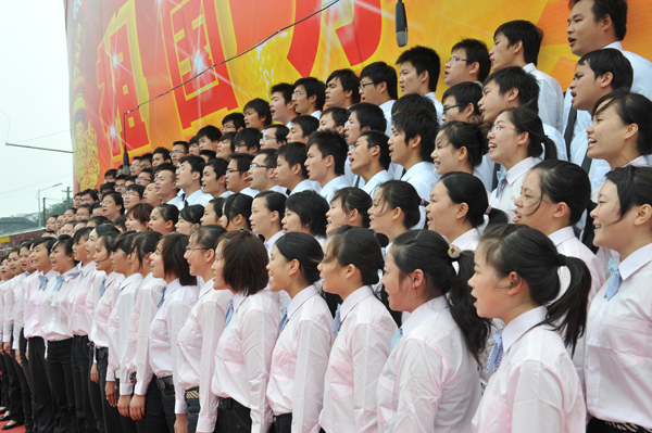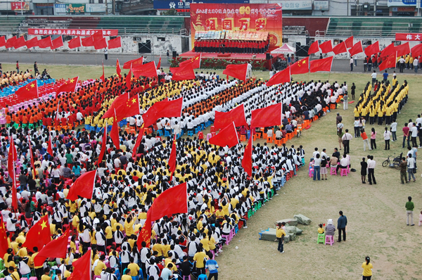 本网讯(员工记者 彭欢)花如海,歌如潮,秋风劲吹,红旗飘扬。“热爱祖国、建设祖国、团结奋进、振兴中华”、“热烈庆祝中华人民共和国成立60周年,伟大的中华人民共和国万岁!”鲜艳的横幅随着火红的灯笼飘扬在公司操场上,9月26日下午的太阳集团122cc,四处洋溢着喜庆的气氛。