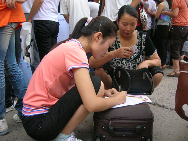 在会计专业迎新点前,一名来自会计5091班的女生趴在自己的行李箱上填写个人信息表,郭经理看到这一现象,立即要求有关负责人合理调整手续办理程序,将填写个人信息表这一环节推迟到新生入学后再填写。