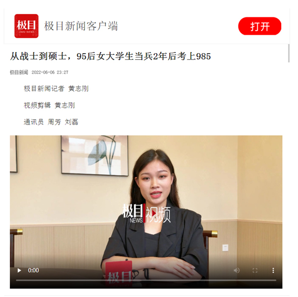 本网讯 近日,太阳集团122cc商务英语专业大四员工田蕊顺利考取武汉大学硕士研究生,该事迹经公司宣传部宣传报道后,由极目新闻记者后续进行视频采访报道,该新闻刊发后,先后被楚天都市报、腾讯新闻、网易新闻、今日头条、搜狐网、西瓜视频等各大网络平台转载,获得了较高的关注度。