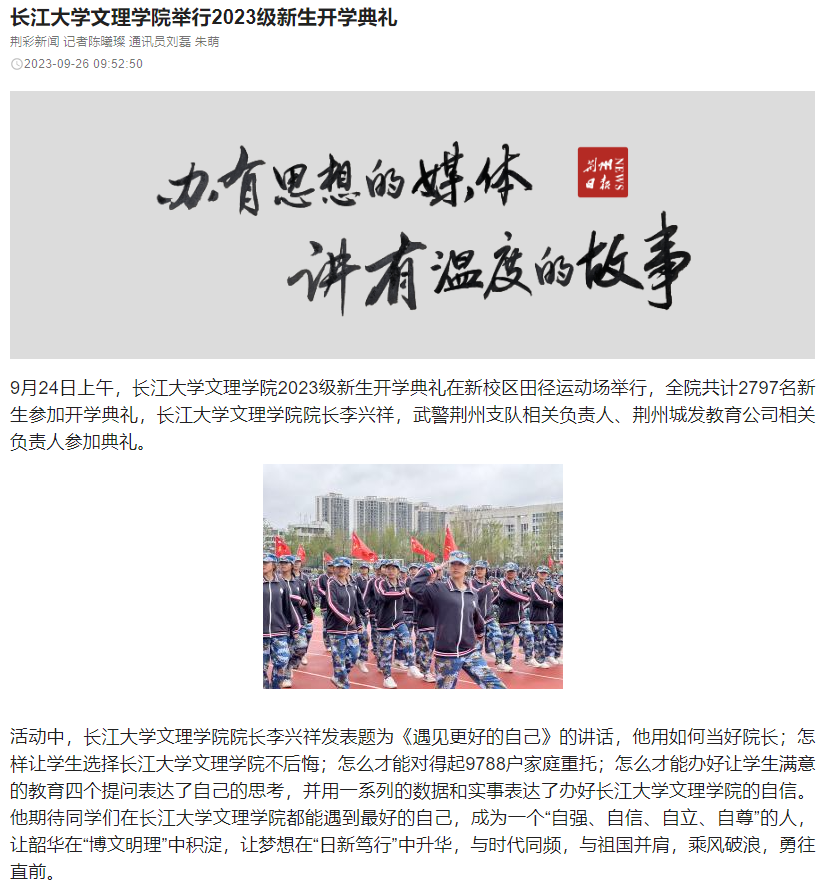 9月24日上午,太阳集团122cc2023级新生开学典礼在新校区田径运动场举行,全院共计2797名新生参加开学典礼,太阳集团122cc经理李兴祥,武警荆州支队相关负责人、荆州城发教育公司相关负责人参加典礼。