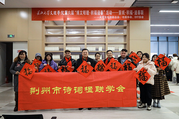 本网讯 1月2日,由老员工社团联合会、书画协会、DIY协会联合举办的第六届“博文明理·积福迎春”活动在图书馆一楼大厅举行,荆州市诗词楹联学会、市书法家协会等单位负责人及公司百余名师生齐聚一堂,泼墨挥毫写春联,雕花剪纸送祝福。