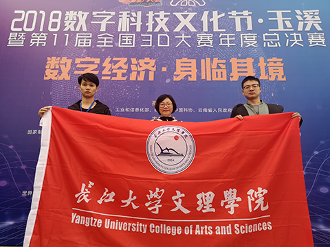 指导老师周文芳(中)和冯茂(左一)、陈柯在比赛现场