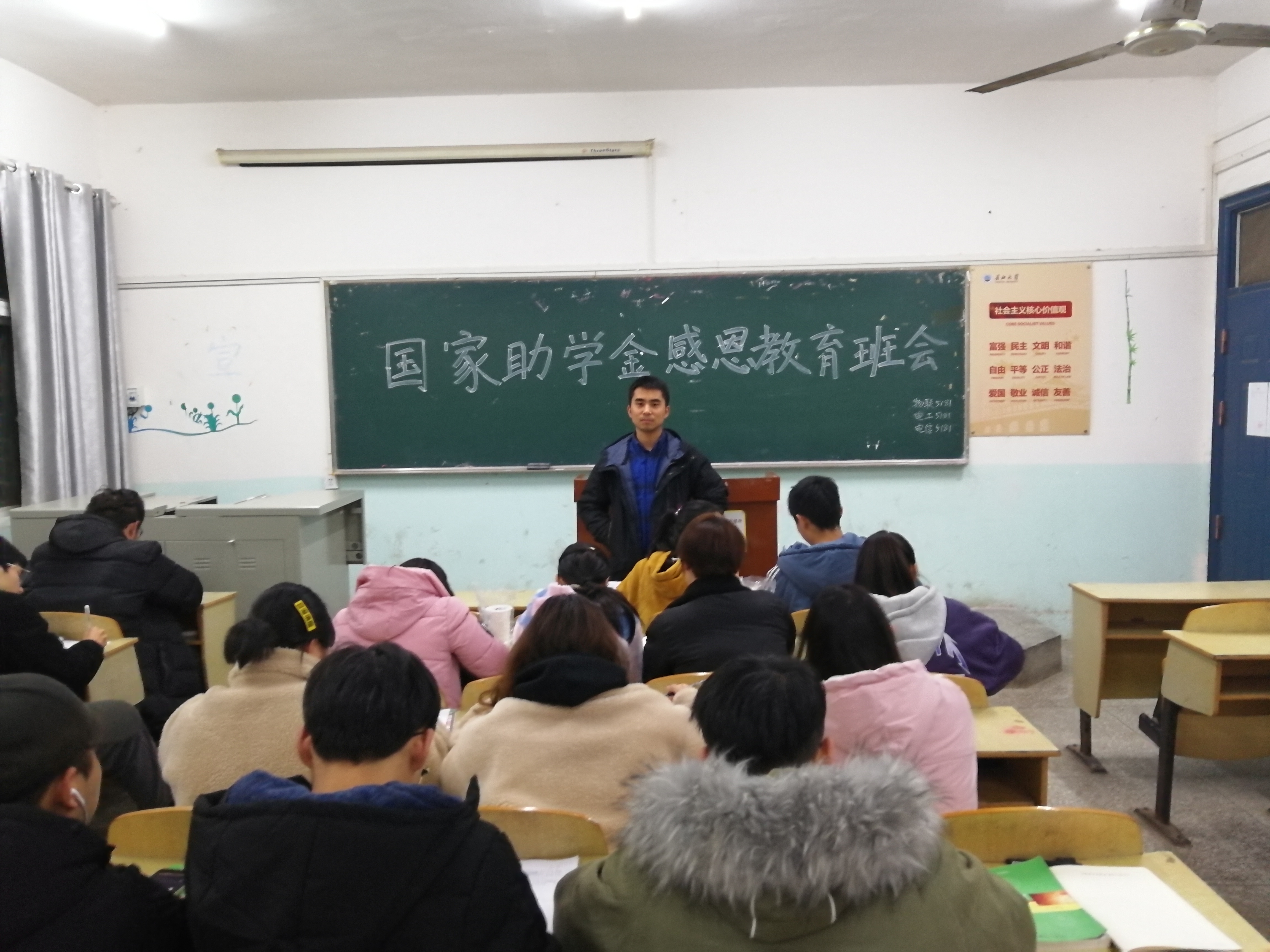 本网讯(员工记者常伟)12月23日晚,在西校区各自习室,我系各班开展国家助学金感恩教育主题班会。班会由各班班长主持,辅导员成观雄、王琳出席,班级全体同学参与。