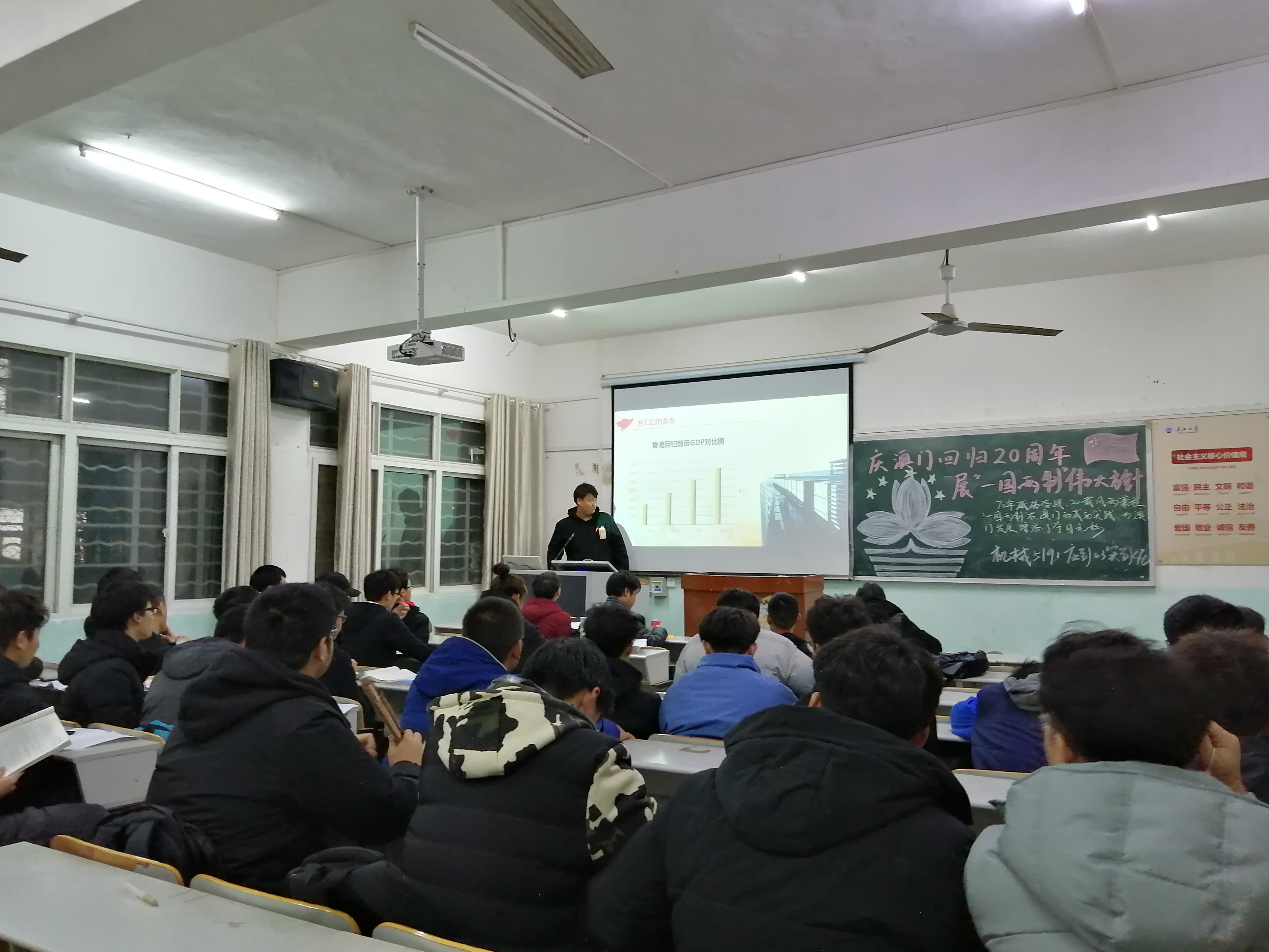 团课上,主持人通过视频播放与PPT展示,向同学们讲述澳门回归的艰辛历程和在“一国两制”方针下的繁荣发展,让大家了解了澳门回归对于祖国统一的历史性意义,也明白了“一国两制”方针的正确性与重要性。随后,他结合具体事例,详细阐述“一国两制”对澳门回归产生的积极影响。