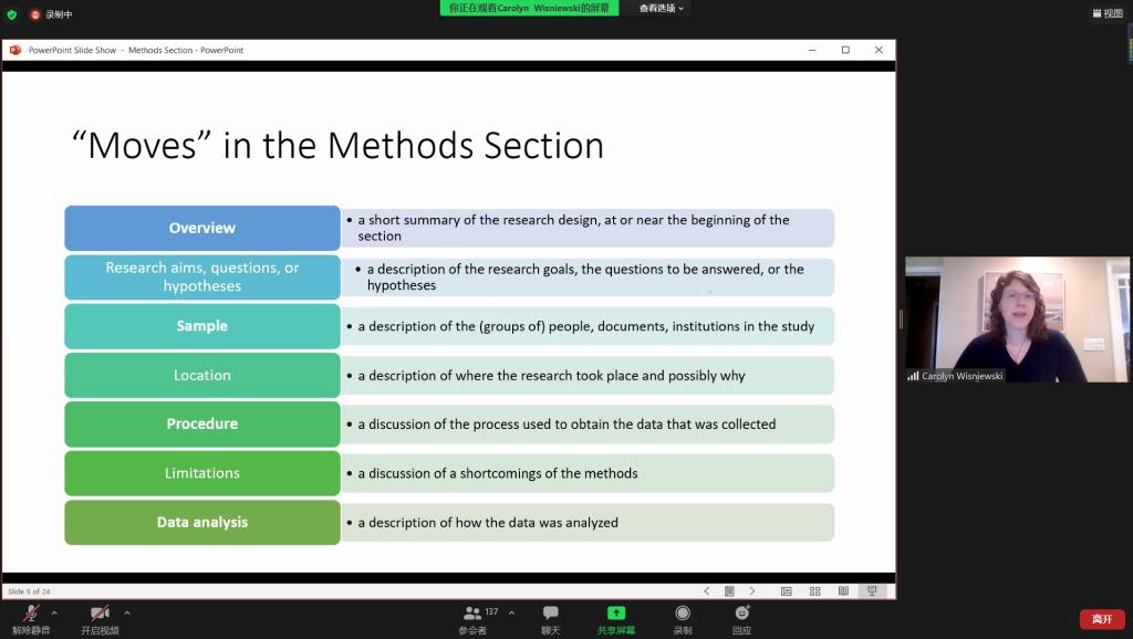 本网讯(员工记者 孙健博 谢东环)为提高同学们的学习兴趣,培养同学们的英文写作能力,第26个世界读书日,我系通过太阳集团122cc图书馆官网公告,在zoom平台上组织观看英文写作专题讲座。讲座由Shuyi Liu、Lian Ruan主持,伊大写作中心主任Carolyn主讲,我系全体同学参与。