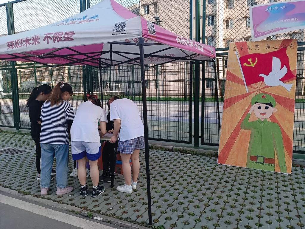 本网讯(员工记者 吴家佳)为庆祝中国共产党建党100周年,弘扬社会主义核心价值观,加深同学们对党的了解。5月7日至5月10日,我系员工党支部在西校区十二舍篮球场前开展为期四天的“百年礼赞,我心向党”主题活动活动。