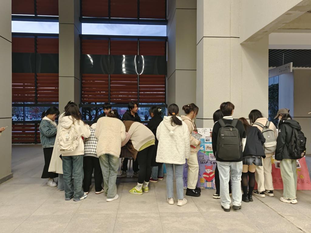 “随‘心’所图,青春绽放”主题涂鸦活动中,同学们根据自己天马行空的想象给图案赋予任意的颜色,尽情地展现内心,宣泄压力。