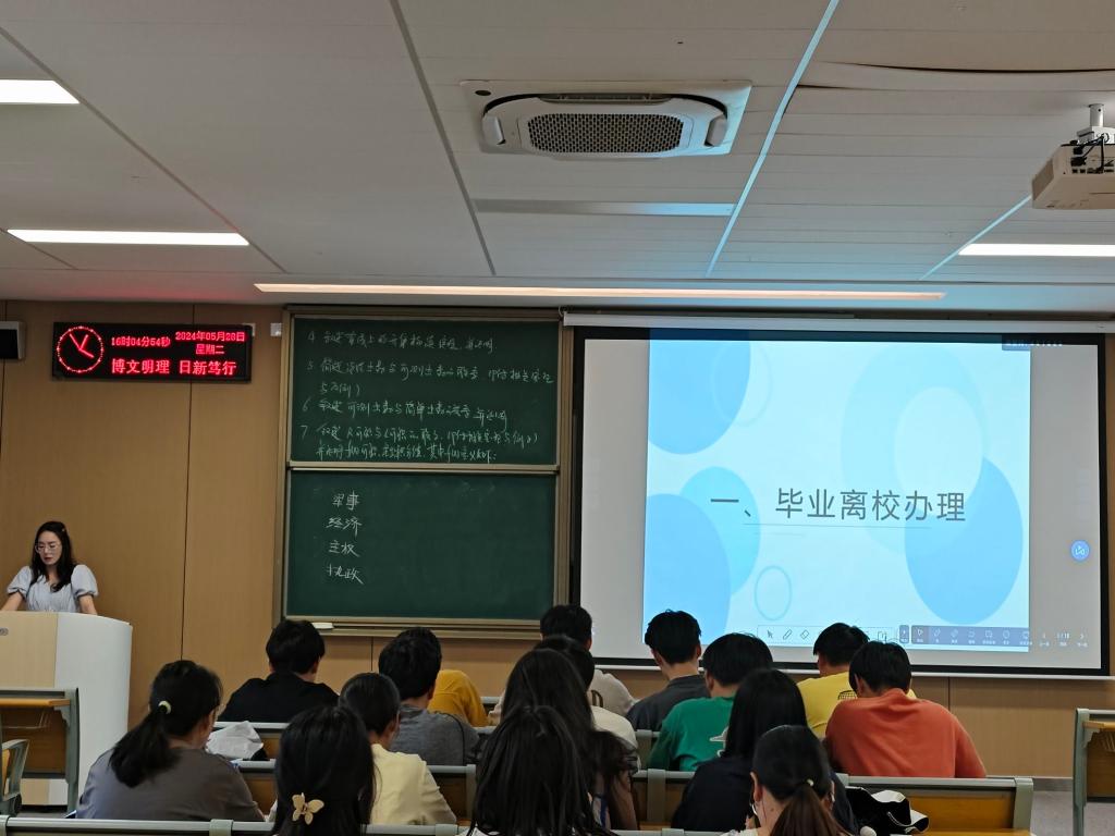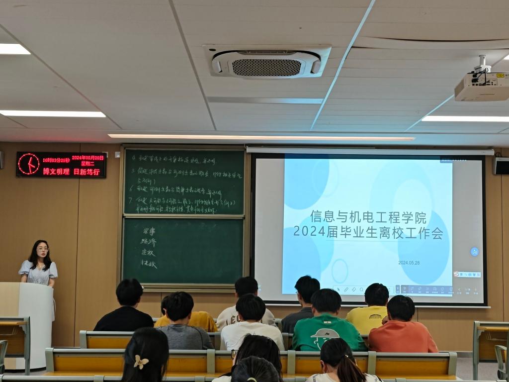 本网讯 (通讯员 赵文慧/文 刘盼、王思齐/摄) 为扎实开展2024届毕业生离校前的教育管理服务工作,进一步做好毕业生的就业工作,5月28日下午,公司召开2024届毕业生离校大会,会议包括安全离校教育主题班会、“学习监察法、争做廉洁人”主题班会、诚信感恩主题教育大会三个板块。会议由各毕业班辅导员主持,公司2024届全体毕业生出席大会。