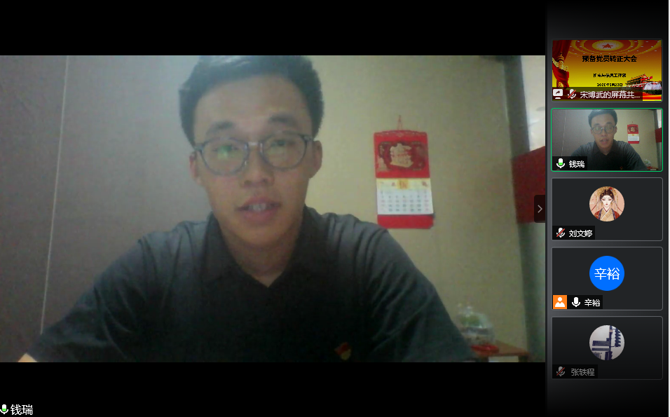 表决阶段,由纪检委员宋博武同志为监票人、宣传委员张仁贵同志为计票人,通过线上群表决通道、监票人和计票人统计。辛裕宣布本次支部大会决议:一致同意宋聪聪、吴神鞭、杨小丰、钱瑞、熊梦园、刘文婷六名同志转为中共正式党员的申请,并在会议公屏鼓掌通过。随后,六名新正式党员同志依次表态,表明自己对大家提出意见的看法和今后的决心。