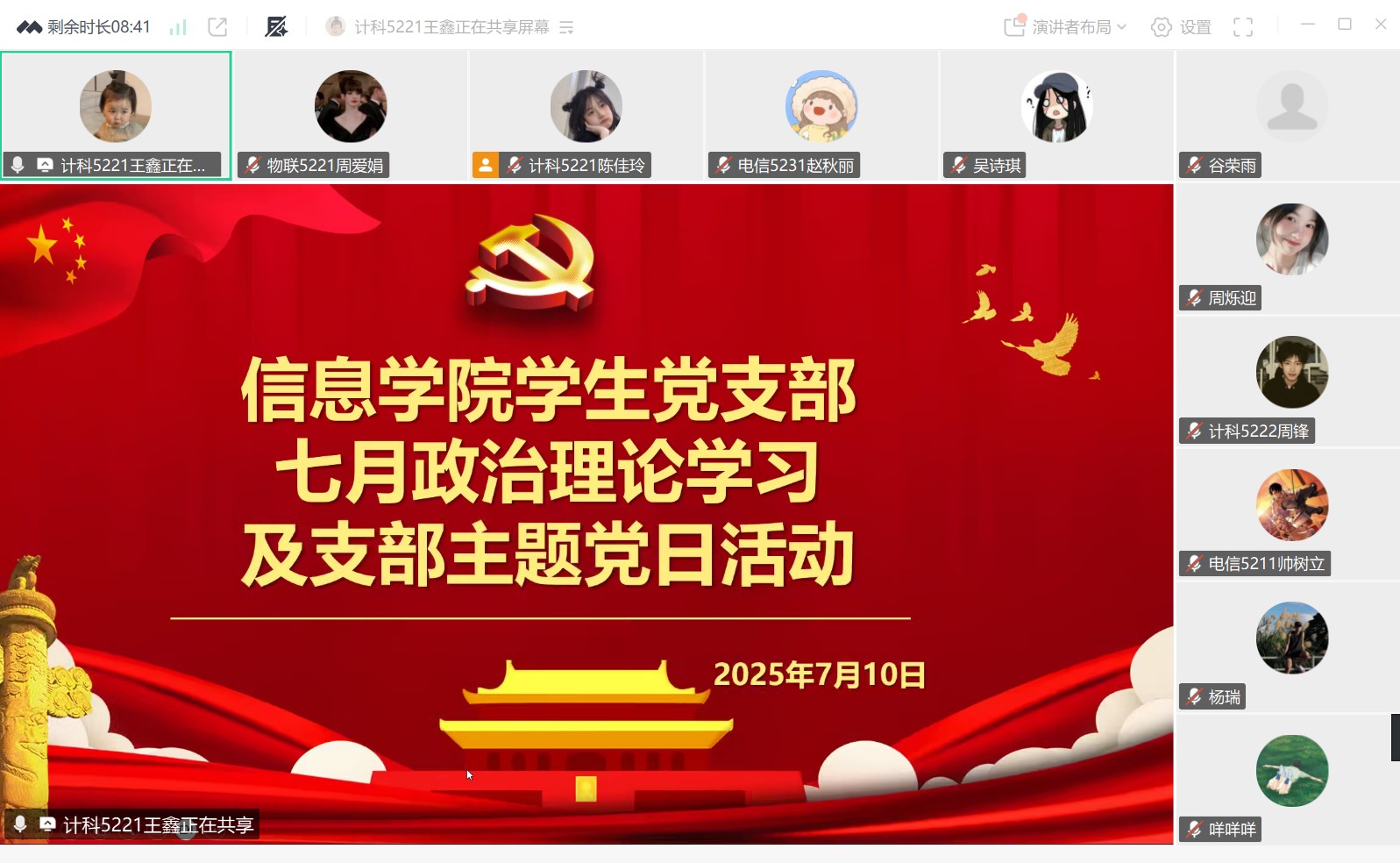 本网讯(通讯员 周爱娟)7月10日晚7点,信息公司员工党支部线上召开会议,开展7月份支部主题党日活动,会议主题是“持续推动深入贯彻中央八项规定精神学习教育走深走实”。会议由王鑫同志主持,员工支部全体党员参加。