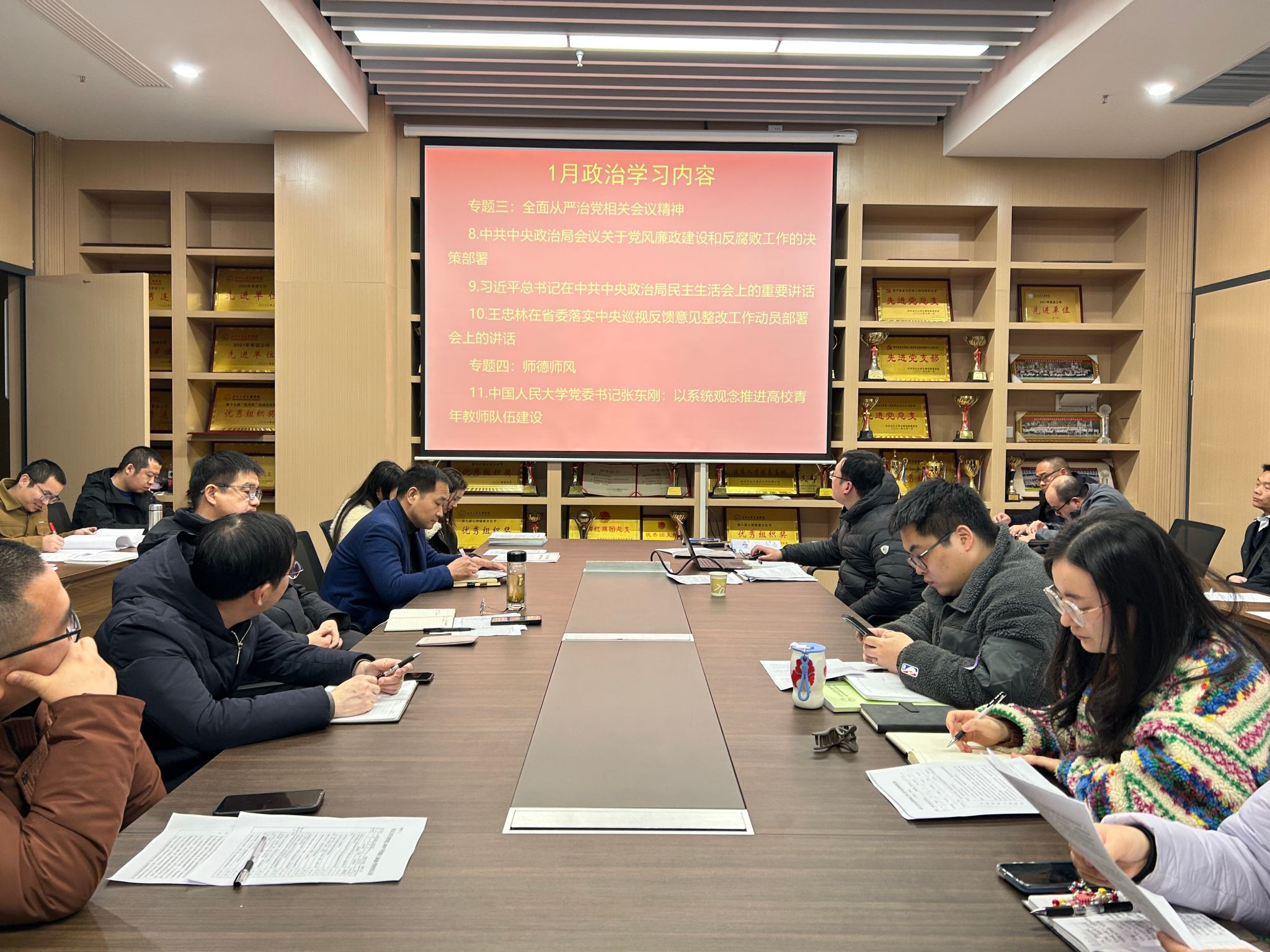 在师德师风专项学习阶段,大家集中学习中国人民大学党委书记张东刚《以系统观念推进高校青年教师队伍建设》文章,观看电视专题片《一步不停歇半步不退让》第一集《纠风治乱为民》,引导大家看清腐败代价、明晰权力边界、筑牢思想防线。