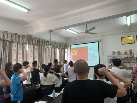 在支部主题党日活动阶段,全体党员缴纳党费,重温入党誓词,集体诵读党章第六章第三十六条(党的干部),以“守初心、担使命、找差距、抓落实”为活动主题,开展“不忘初心、牢记使命”主题教育活动。