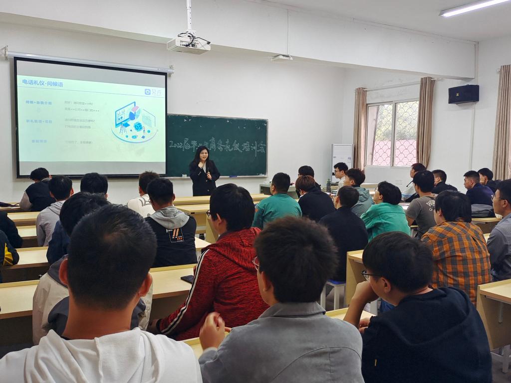 本网讯(员工记者 湛点)10月15日,在三教205教室,我系开展2022届毕业生商务礼仪培训会议。会议由武汉贝壳校园招聘部经理李文静主持,系辅导员成观雄出席,2022届毕业生参加。