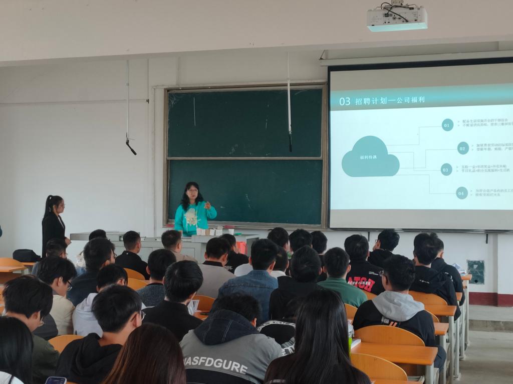 招聘会上,该公司人事经理吴阳涛围绕“企业发展”、“企业文化”、“工作环境”、“特色活动”等方面,向同学们介绍了该公司的基本情况。随后,她针对同学们关心的“常规薪资”和“福利待遇”问题进行详细阐述,并邀请我系优秀毕业生胡波为同学们分享任职经历,回答同学们提出各项问题,帮助同学们更直观地了解该公司的人才培养体系。最后,她组织现场的同学们扫码答题。招聘活动在同学们热烈的掌声中圆满结束。