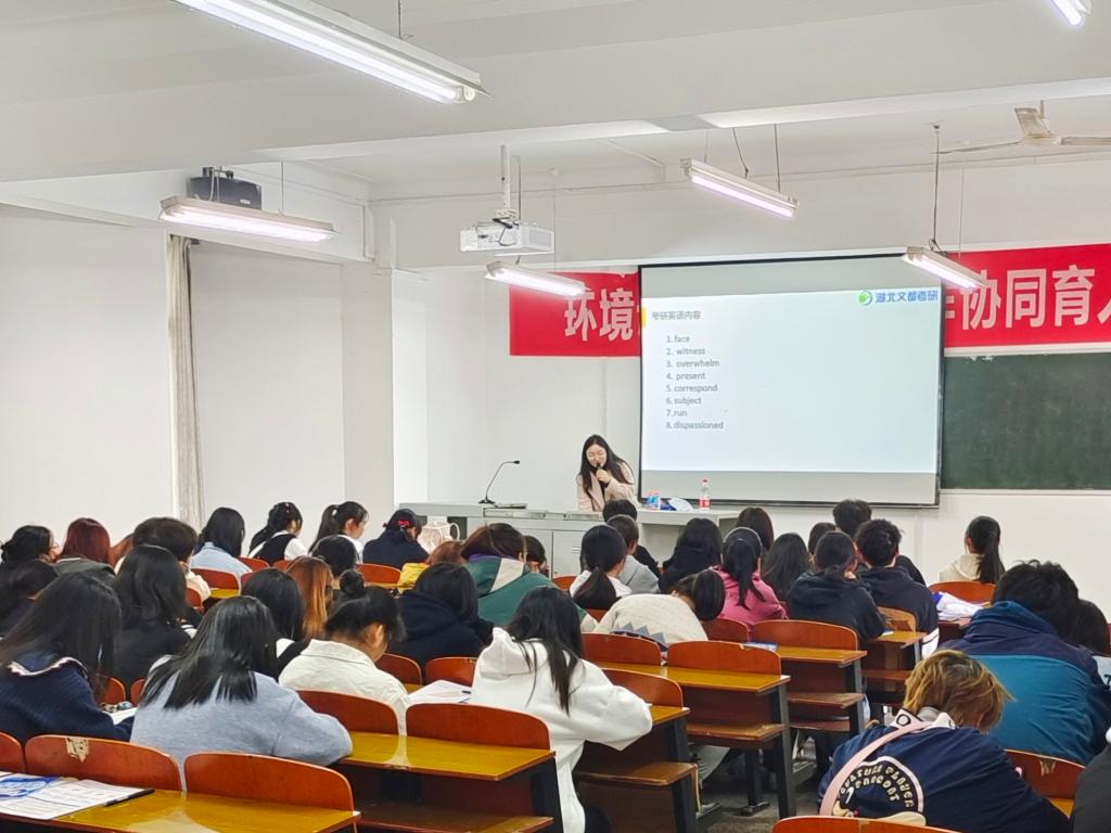 讲座开始,主持人结合当前考研形势和自身就业经历展开叙述,突出了考研的影响和作用。随后,她围绕复习内容、词汇要求、考前规划三个方面,向同学们普及了考研英语的备考知识。她提醒同学们要注意词汇积累,重视语法学习,加强翻译锻炼,并用两个英语单词“action”与“perseverance”为本次讲座进行总结。她希望每位同学都能有所行动,并在考研这条道路上坚持不懈的走下去,成功上岸。