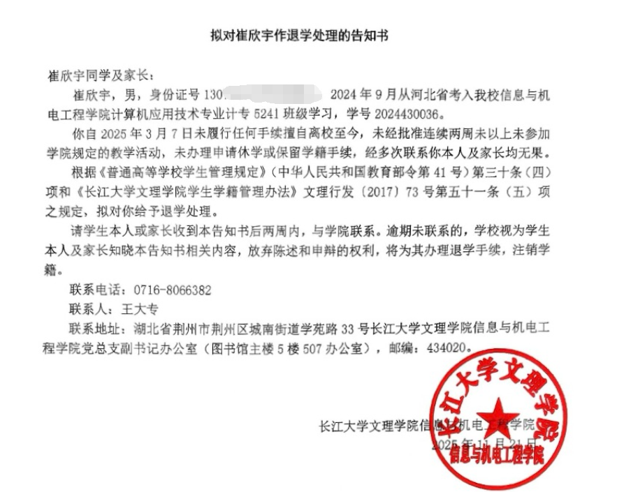 崔欣宇,男,学号2024430036。2024年9月从河北省考入公司信息与机电工程公司计算机应用技术专业计专5241班级学习。该生于2025年3月7日起未履行任何请假手续擅自离校,至今未返校;未经批准连续两周未参加公司规定的教学活动,也未办理申请休学或保留学籍手续;公司老师经多次联系员工本人和家长,均无果。