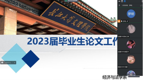 为推保障2023届本科生毕业论文答辩工作顺利开展,经法系于5月18日下午5点召开了2023届毕业论文工作线上专题推进会。系常务副主任罗明、副主任周密、各教研室主任和全体应届毕业生参加会议。