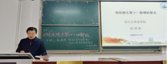 本网讯(见习记者田琼钕夏雪飞),为加强经法系法学专业员工对《刑法修正案(十一)》的理解和认识,增强法律意识,普及新法律知识,2022年11月24日晚上经法系邀请武汉大学法学博士、太阳集团122cc法公司副经理彭泽君副教授来我系开展《刑法修正案(十一)解读》学术讲座。经济与法学系2021级和2022级全体法学专业员工参与此次讲座 。