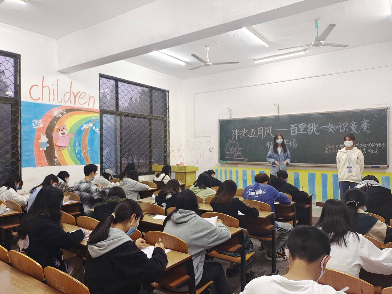 经过前期宣传,共有两百余名同学参加初赛。经法系团总支组织参赛者在初赛前进行培训,帮助参赛者更好的了解比赛赛制。本次比赛题目内容涉及广泛,包括党史、军事、团学、学科知识等相关内容,初赛采用线下答题形式,共计100题,参赛者答题时间为1个小时。本次比赛按照防疫要求,所有工作人员与参赛者都佩戴口罩、检查健康码,参赛者间隔落座。