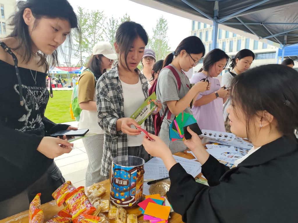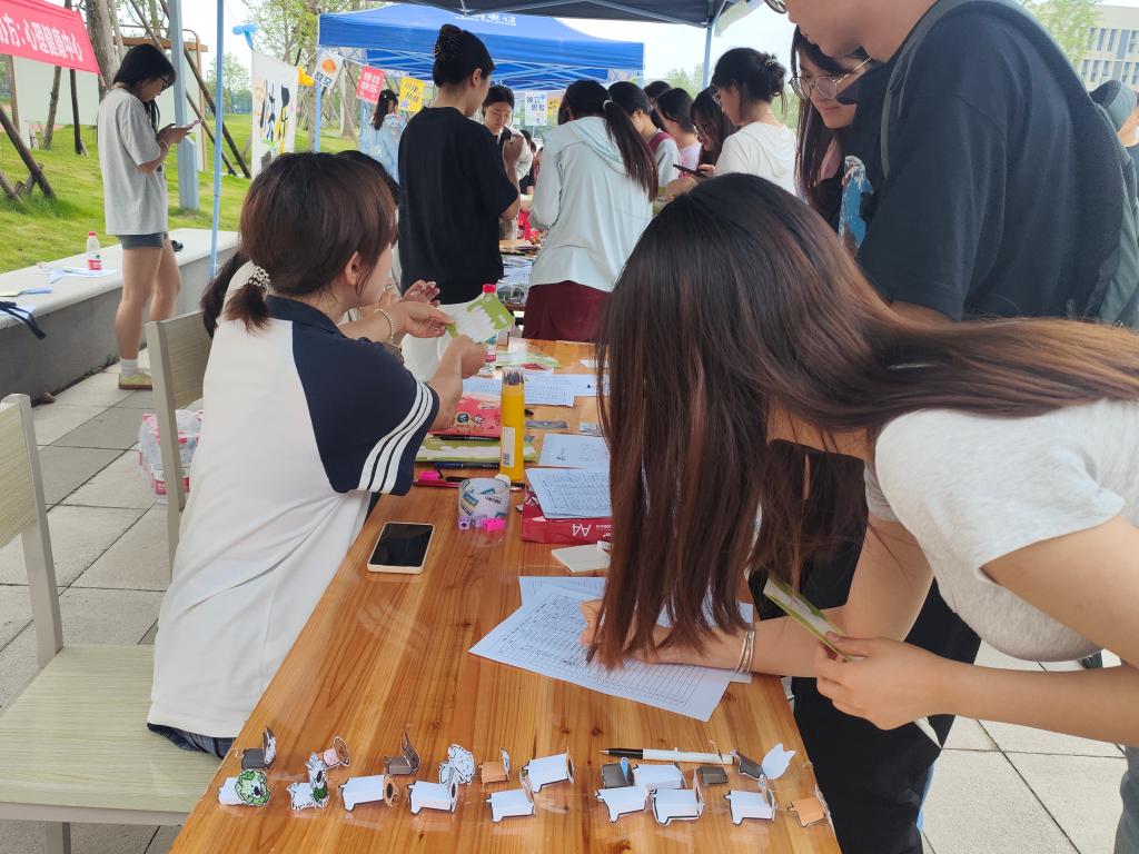 最受欢迎的当属 “压力消消会”。参与者自选答题数目,通过回答心理小测试获取带有颜色的小卡,不同颜色对应不同类型的压力。游戏规则巧妙,只要收集到两张相同颜色的小卡即可 “消除” 压力,获得积分。现场气氛热烈,同学们不仅绞尽脑汁答题,还积极与他人交换卡纸凑对积分,现场充满欢声笑语。活动根据积分设置了丰厚奖励,1 - 4 分可兑换迷你捏捏玩具,5 - 9 分能获得变色烤鹅挂件,让大家在游戏中释放压力的同时,还能收获惊喜。