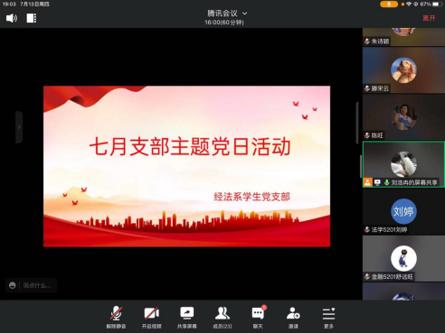 (员工记者 朱诗颖)2023年7月13日晚7时,在腾讯会议开展我系员工党支部7月员工支部党日活动。会议由员工党支部书记杨杉杉主持,辅导员滕宋云、卢佳智、刘豪、刘曼莹和经法系全体员工党员参加。