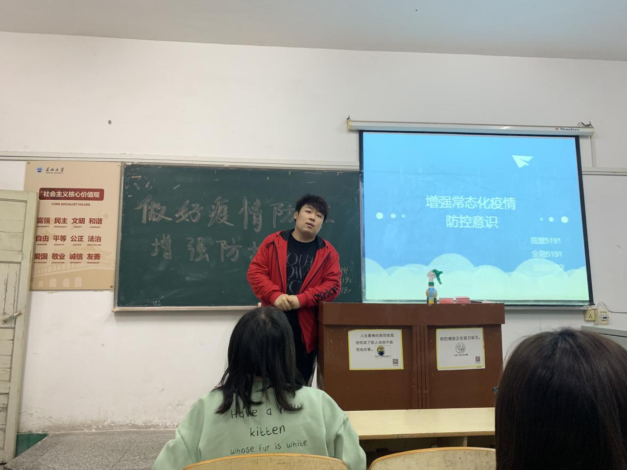 本网讯(通讯员:段敬雄)为加强疫情防控常态化,经法系于10月20日召开增强疫情防控意识主题班会。辅导员卢佳智、文国霞、滕宋云组织各班有序召开主题班会,增强员工疫情防控意识、加大校园疫情防控力度,贯彻落实疫情常态化管理工作。