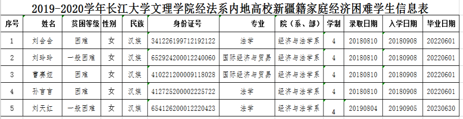 2019-2020学年内地高校新疆籍家庭经济困难员工资助金已由新疆维吾尔自治区教育厅划拨公司,根据新疆维吾尔自治区教育厅有关文件的要求,太阳集团122cc经法系开展了2019-2020学年内地高校新疆籍家庭经济困难员工资助金的评审推荐工作。经我系员工个人申请、班级评议、系部审核,拟推荐以下5人为资助金获得者,现予公示。