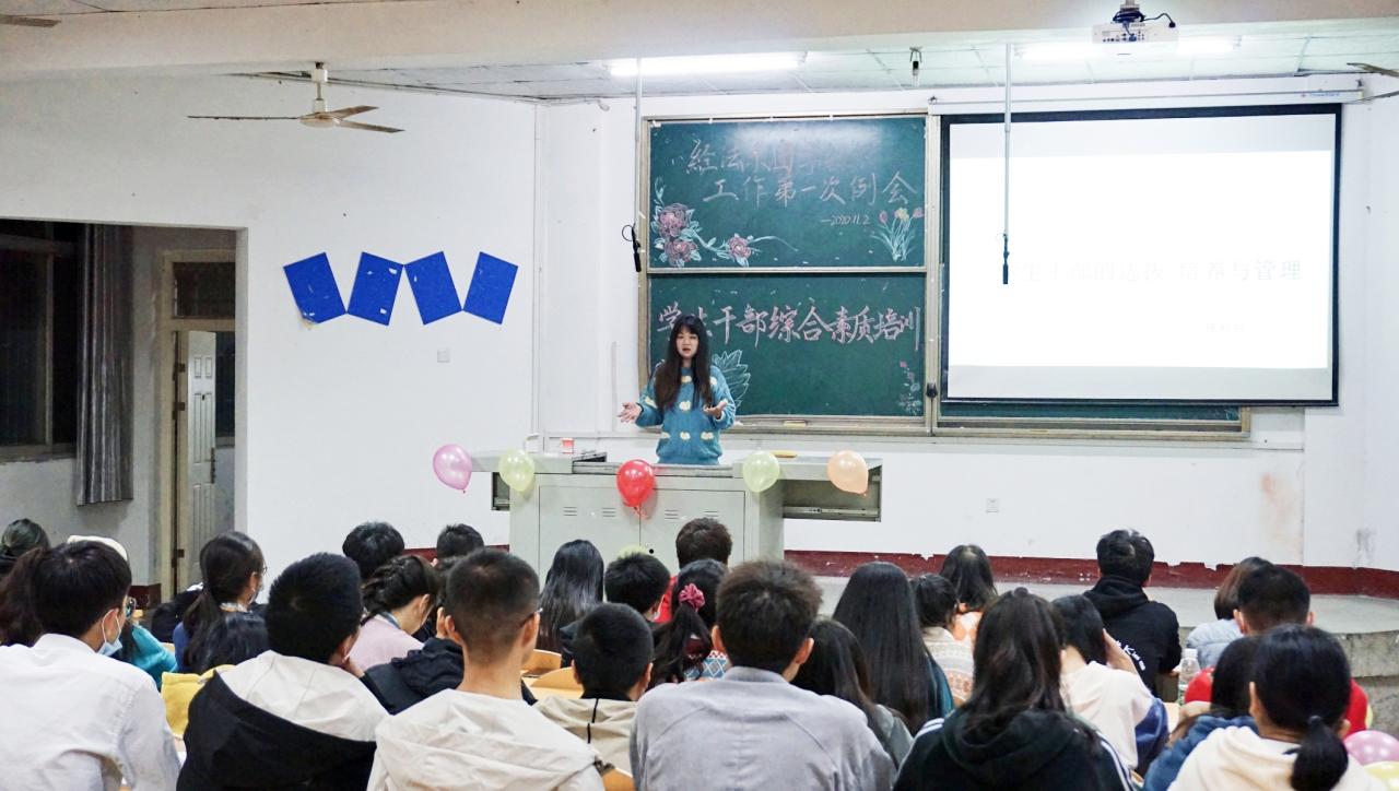 本网讯(通讯员:郑驰 邓安琪)11月2日晚,经法系于4教200召开员工干部综合素质培训大会暨经法系第十六届团学组织工作第一次例会。与会人员有经法系19级、20级所有员工干部及志愿者服务队全体成员。会议邀请到党总支副书记杨杉杉老师、辅导员卢佳智老师、滕宋云老师参会。大会由秘书处部长谭舒文主持。