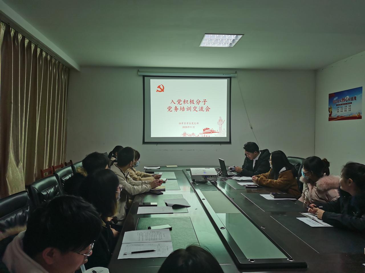 员工党员江晟瑀、黄佳林通过PPT演示向各位入党积极分子讲解了员工党员发展的大致流程与“培养教育考察表”的填写必要:“为什么要进行培养考察”、“从入党积极分子到发展对象再到预备党员需要怎么做需要培养考察多少次”;员工党员涂思雯、王嫚与各入党积极分子进行谈话并记录其思想过程。
