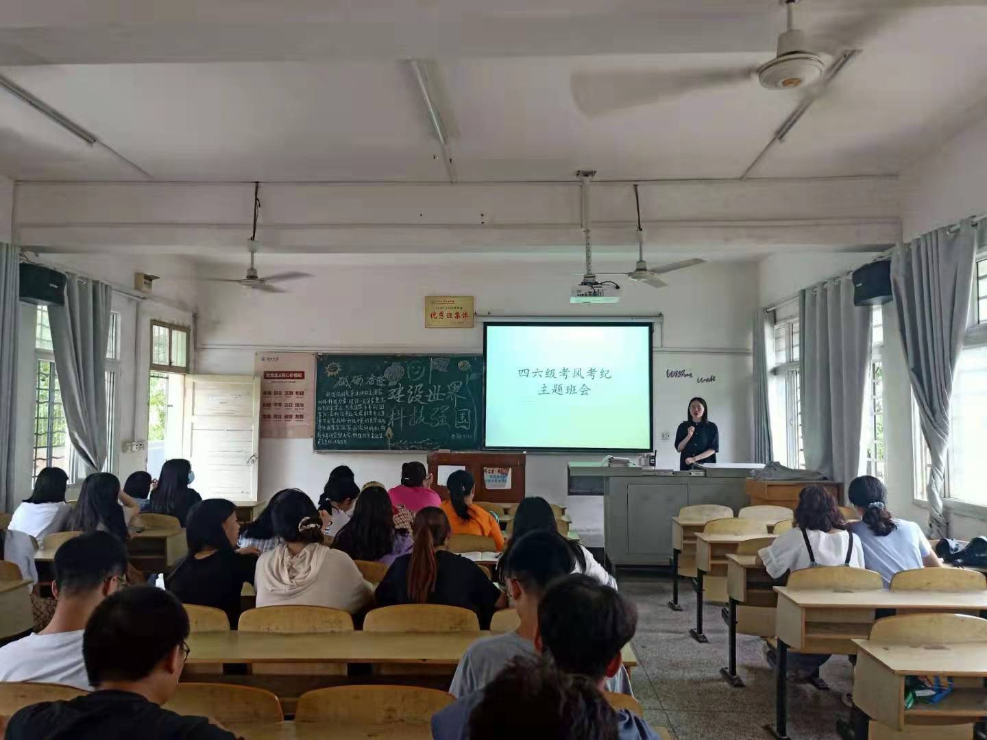 首先,主持人向同学们讲解英语四六级考试的考试时间、考试地点、考试必带品及考试中的规则。其次,主持人指出了考试作弊的严重性,强调树立道德之新风,立诚信之根基是当代老员工义不容辞的责任。最后,辅导员进行总结,希望同学们树立信心,珍惜机会,保持平稳的心态,通过不懈努力取得一个令自己满意的成绩。