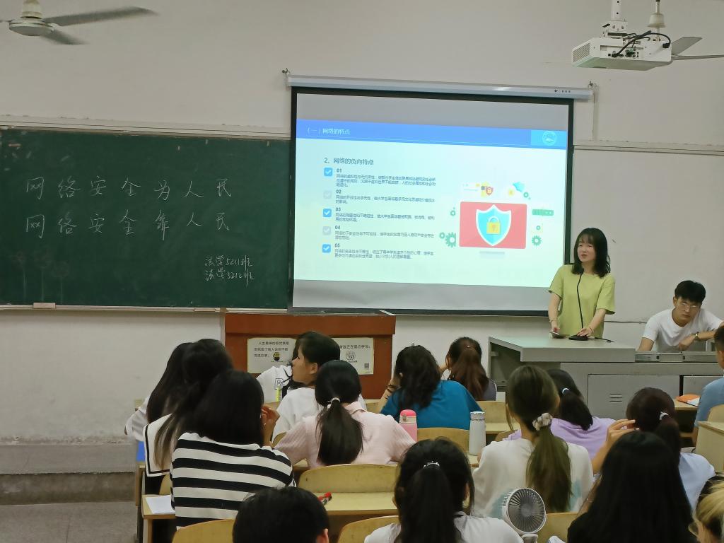 班会开始,由主持人从网络行为安全、网络交易安全和网络交友安全三个方面向同学们讲述了关于网络安全的知识,接着以近期发生的真实事例来介绍有关网络安全的相关内容,并以网络安全知识竞赛的方式进行了进一步的调查提问,同学们也给出了积极的回应。最后主持人以演讲的形式再次强调了网络安全教育的重要性。