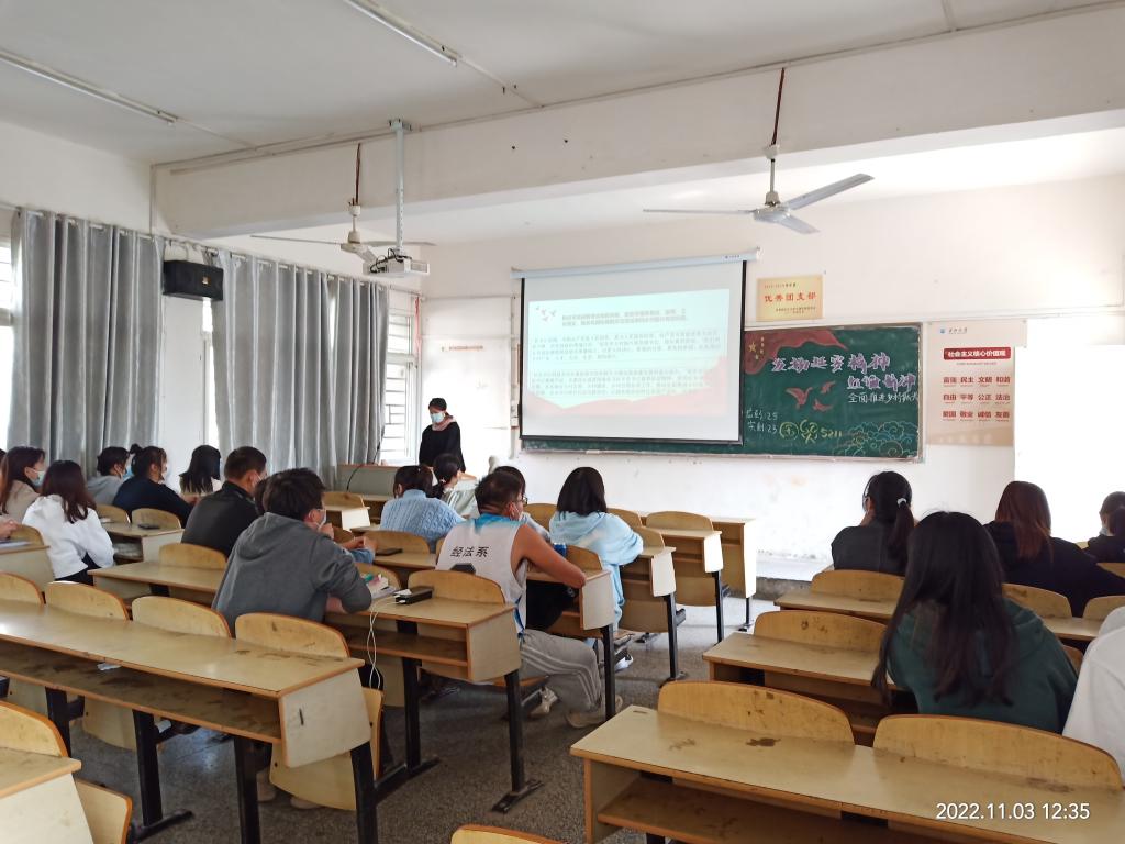 本网讯(见习记者胡赣砺 韩夏美 涂诗怡)11月3日,为了贯彻落实学习党的二十大精神,弘扬和传承延安精神和红旗渠精神,经法系组织各班召开以“发扬延安精神和红旗渠精神,全面推进乡村振兴——习近平总书记在陕西省延安和河南安阳考察所作的重要讲话”为主题的团课活动。学习延安精神和红旗渠精神,树立正确的人生观、价值观和世界观。