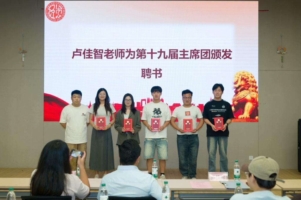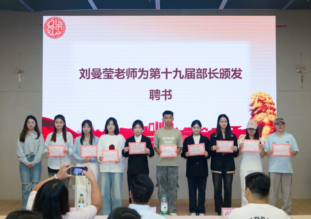 大会第二项,由卢佳智、刘曼莹分别为十九届主席团及部长颁发聘书。