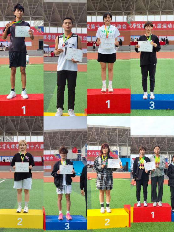 开幕式后,运动会的各项比赛项目紧锣密鼓地展开。在个人项目上,经法系运动员们在赛场上顽强拼搏,奋勇当先。赵媛媛同学斩获女子跳远第一名和女子100米第一名,吴超琼同学包揽女子跳高、女子800米冠军。陈思绪同学在男子 400 米比赛中一马当先,勇夺冠军,同时在男子跳远项目中也取得了第四名的好成绩。王煜喆同学在男子 100 米和 200 米的赛道上尽显风采,双双荣获第二名。刘紫怡同学在女子 400 米项目中上演了精彩的逆袭,从预赛的第三名成功反超至决赛的第二名,张香琪同学在女子 200 米的比赛中更是实现了逆风翻盘,预赛中排名第八的她,在决赛中奋力一搏,荣获第三名。于琪琪同学在 800 米项目中斩获第二名。在团体比赛项目上,我系斩获女子4×100米项目第一名、女子4×400米项目第一名、男子4×100米项目第二名、男子4×400米项目第二名、20×60米接力赛第六名的好成绩。运动员们在赛场上挥洒汗水,用拼搏和努力诠释了体育精神,他们是团队的骄傲,他们的出色表现将激励着经法学子勇往直前,追求卓越。