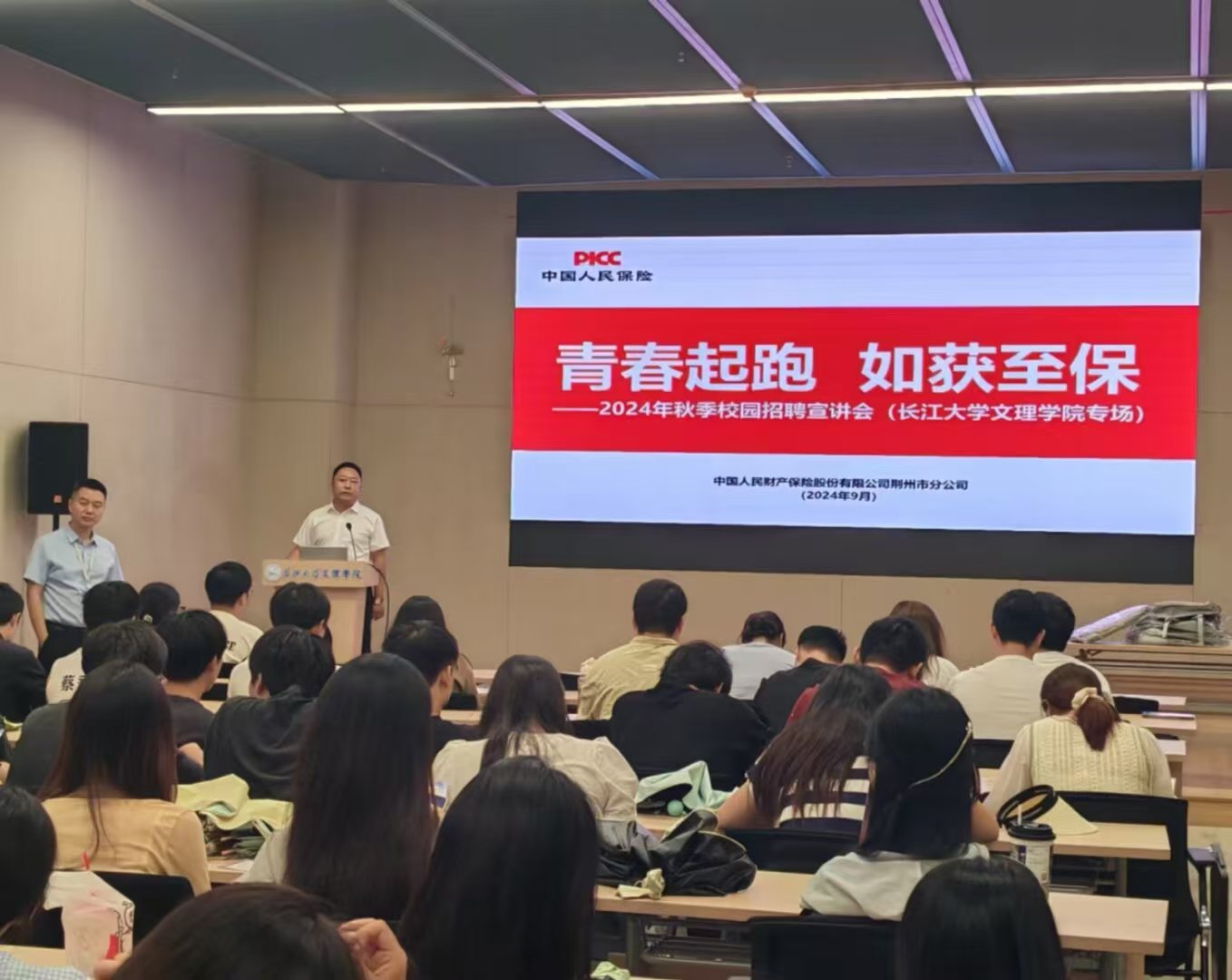 经济与法学系携手中国人民财产保险股份有限公司荆州市分公司于9月30号在图书馆103报告厅成功举办了主题为“青春起跑,如获至保”的秋季校园招聘宣讲会。活动旨在为即将毕业的员工提供就业指导和就业机会,同时为人保财险荆州市分公司输送新鲜血液。