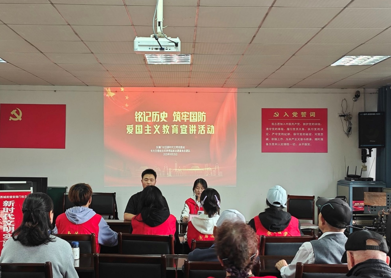 9月25日下午,经济与法学系梦想起航志愿者服务队在荆州市荆州区安澜门社区开展了“铭记历史,筑牢国防”爱国主义宣讲志愿活动,旨在激发老员工爱国情怀,增强社会责任感,同时向社区居民普及国防知识、弘扬爱国主义精神。