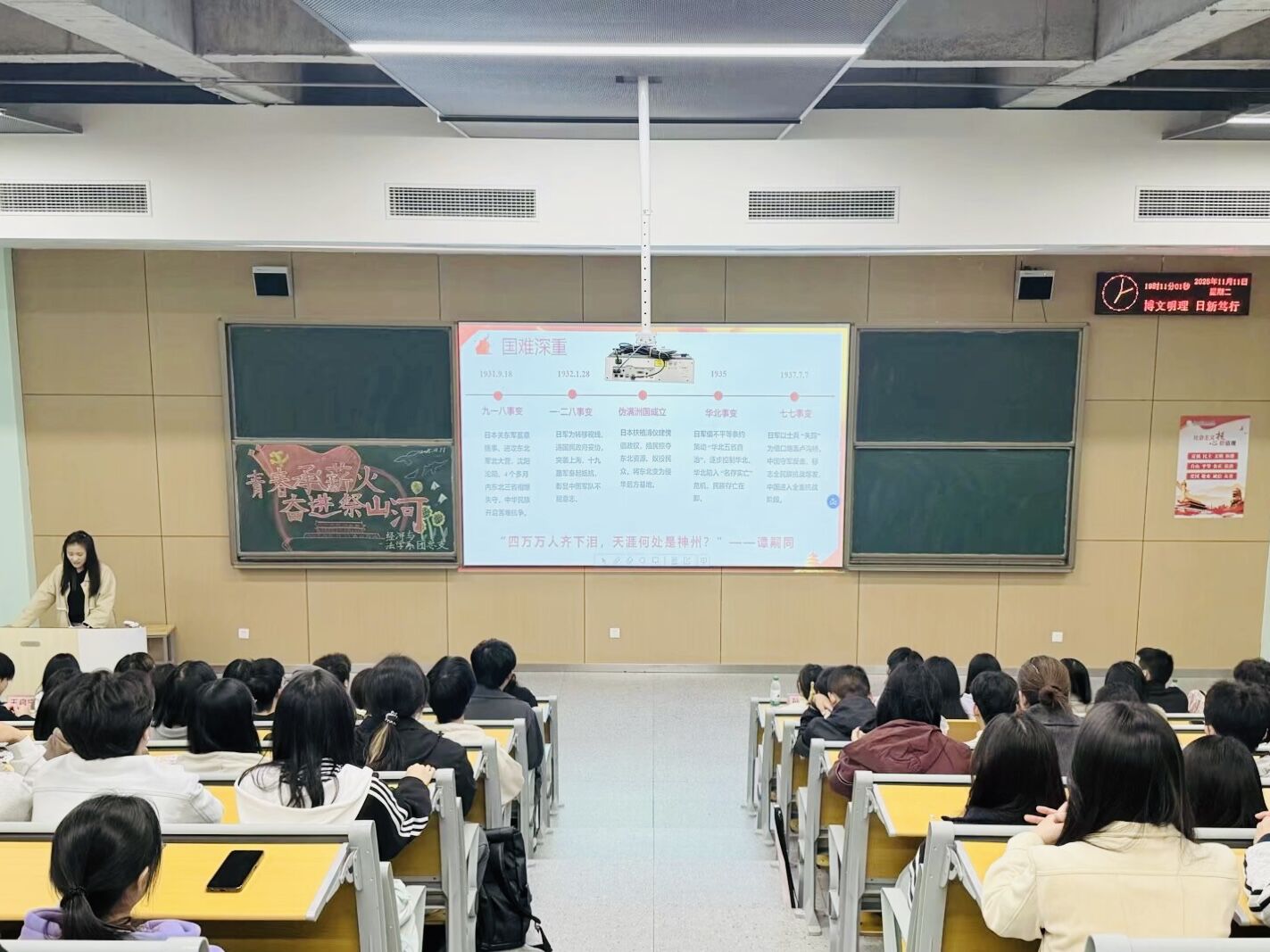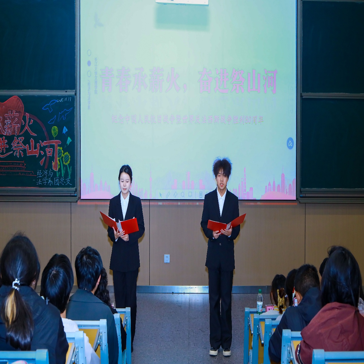 本网讯(见习记者:王宗琦)八十春秋流转,初心信念恒昌,抗战的热血与赤诚穿越时空,化作民族复兴路上的不竭动力,照亮前行征途。为铭记光辉历史,传承伟大抗战精神,加强对青年的思想政治引领,11月11日晚上,经济与法学系团总支在主校区教学楼B-213成功举办了“青春承薪火,奋进祭山河—纪念中国人民抗日战争暨世界反法西斯战争胜利80周年”主题团课公开课。系党总支副书记杨杉杉、系团总支指导老师卢佳智、辅导员刘曼莹莅临现场,与同学们共同参与了这场深刻而富有教育意义的精神洗礼,团课由秘书处冷誉岳、何俊雯主持。