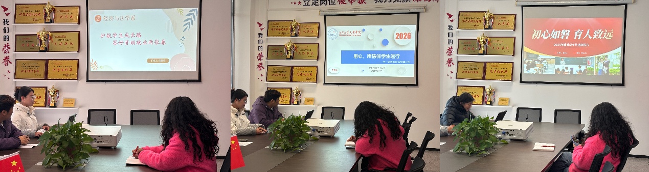 本网讯(见习记者 王宗琦)为全面总结2025年度员工工作成效,深入交流育人经验,科学谋划未来发展,1月7日,经法系于系会议室组织召开年度工作述职大会。会议紧紧围绕立德树人根本任务,通过系统述职与集中点评,旨在进一步加强辅导员队伍专业化、职业化建设,持续提升员工教育管理服务效能,为2026年度工作开好局、起好步奠定坚实基础。系党总支书记辛裕、党总支副书记杨杉杉及全体辅导员出席会议。