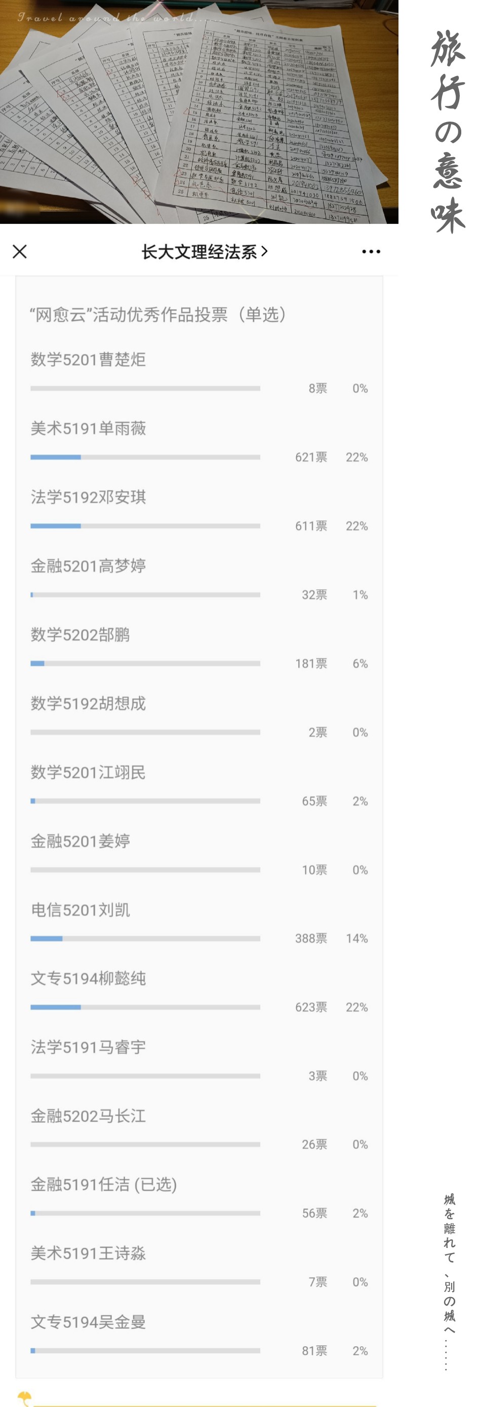本次“抛弃烦恼、找寻自我”心理活动共分为四个板块:“白板涂鸦”、“挂住烦恼,保留开心”、“网愈云”和心理健康主题班会。首先,在白板涂鸦活动中,同学们可以在白板上随心所欲的涂鸦,以帮助同学们在日常生活中,适当的放松自己、减轻压力。其次,在挂住烦恼,保留开心的板块中,同学们以在小纸条写上心中所想、所愿装进“漂流瓶”中并挂起来的形式,来寄托对生活美好的期望。最后,是网愈云的板块中,需要参与活动的同学们叙写自己与一首歌的故事并参与评选,与大家一起分享歌中的小故事。并通过初选和网上投票的方式,评定出最终的评选结果。在心理活动期间,各班组织召开了“与爱同行”的主题班会。以更好的宣传心理知识,让同学们开始关注心理健康问题。