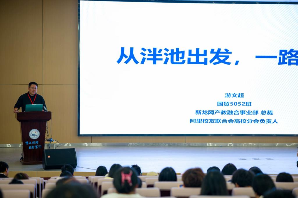 随后,员工游文超结合自己的创业经历与我系学子分享了他的个人见解。作为阿里员工联合会的代表,他告诫我系学子们成功并非终极目标,重要的是经历本身。员工游文超用自己的亲身经历激励大家,即使面对挫折也不应气馁,要学会把握机遇。他最后送给我系学子们一句箴言:要尽早对自己的人生进行规划,多与优秀且成功的人士交流,用他们的视角审视自己,同时也要认识到选择的重要性大于努力,并与时代趋势同行;学会向外拓展,向内寻求。