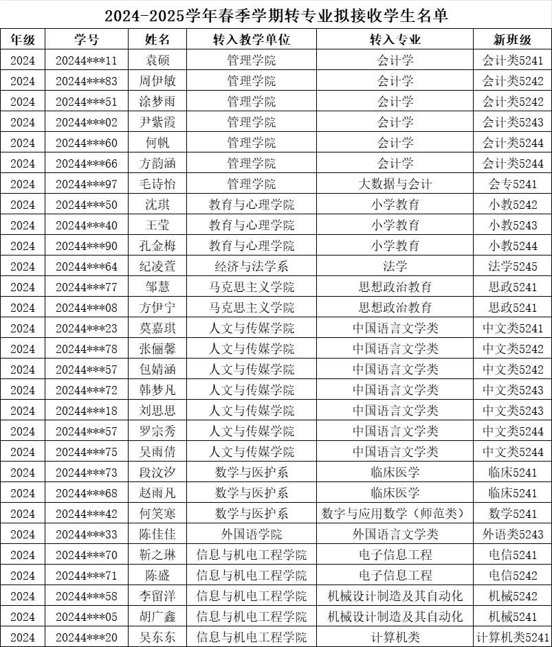 根据《太阳集团122cc专业分流与转专业管理办法》(文理行发〔2023〕64号)精神,按照转专业相关工作要求,经员工本人申请,招生处及所在教学单位审核,申请转入教学单位综合考核,教务处复核,拟同意袁硕等29名同学转入新专业学习,现将结果予以公示(见附表)。