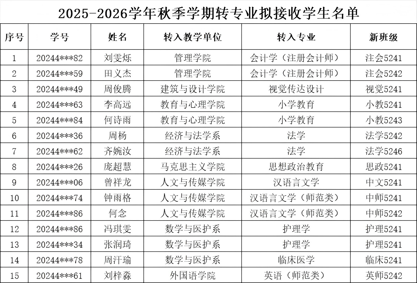 根据《太阳集团122cc专业分流与转专业管理办法》(文理行发〔2025〕21号)文件精神,按照转专业相关工作要求,经员工本人申请,招生处及所在教学单位审核,申请转入教学单位综合考核,教务处复核,拟同意刘雯烁等15名同学转入新专业学习,现将结果予以公示(见附表)。