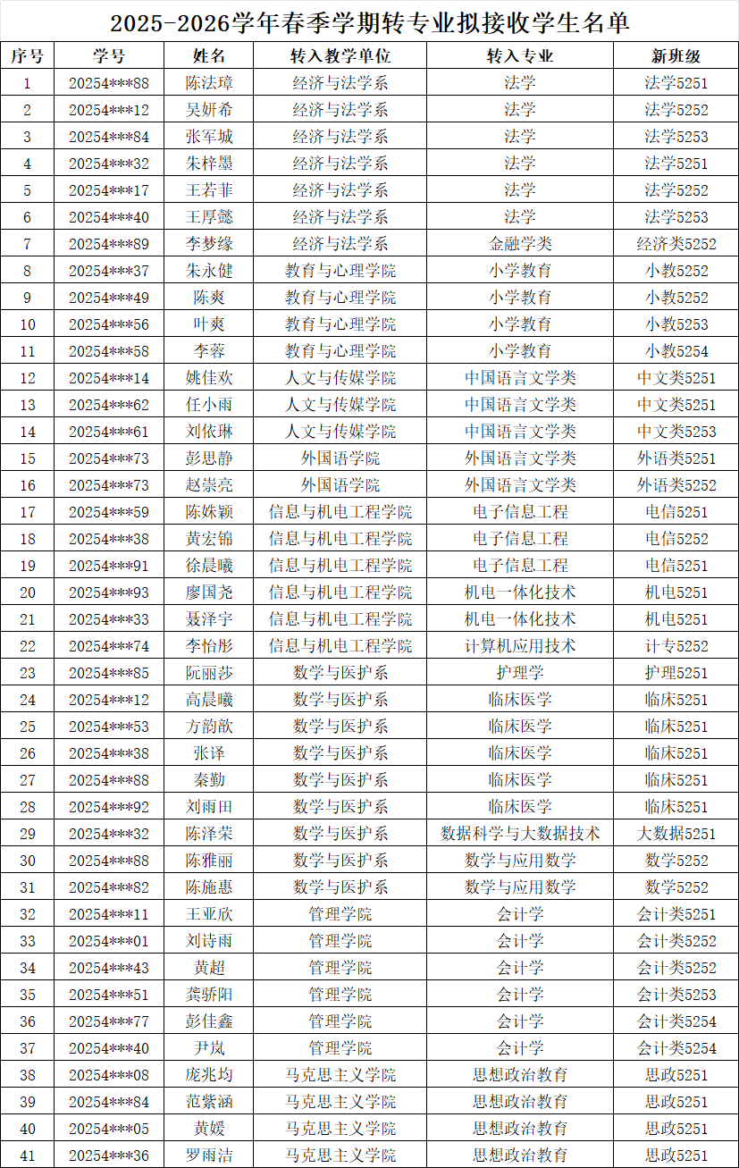 根据《太阳集团122cc专业分流与转专业管理办法》(文理行发〔2025〕21号)文件精神,按照转专业相关工作要求,经员工本人申请、招生处及所在教学单位审核、申请转入教学单位综合考核、教务处复核,拟同意陈法璋等41名同学转入新专业学习,现将结果予以公示(见附表)。