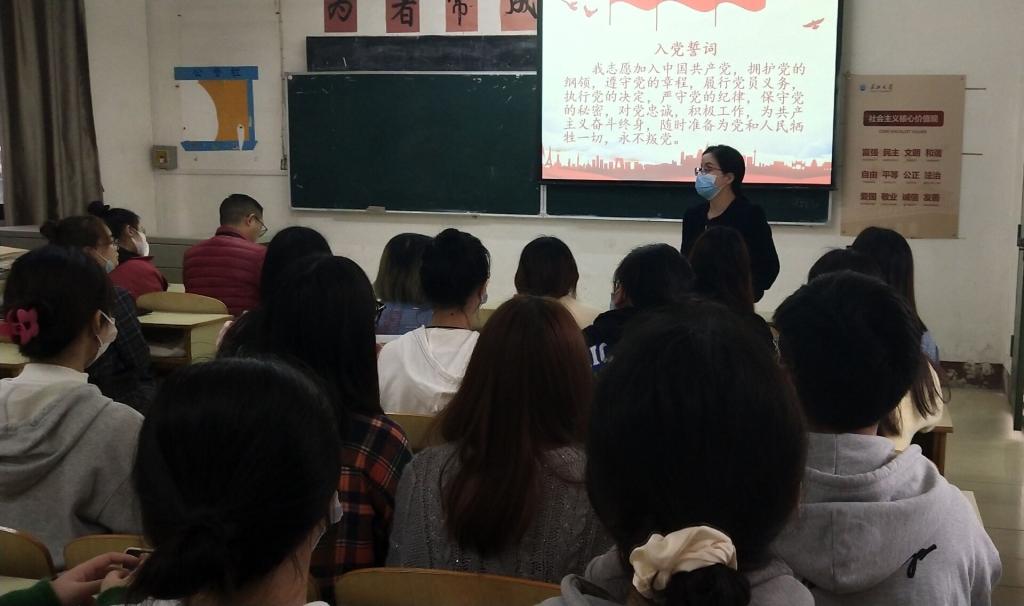 会议严格按照党组织接受预备党员程序进行,大会伊始,发展对象们宣读《入党志愿书》,并向党组织汇报自身对党的认识、入党动机、个人经历以及在校表现等;随后,该入党介绍人覃儒卿同志向大会介绍其主要政治思想、学习、工作生活等情况,与会党员对发展对象是否符合党员条件充分发表意见。经大会充分讨论并经与会正式党员无记名投票表决,7票赞成、0票弃权、0票反对,大会一致同意接收向艳同志成为中共预备党员。