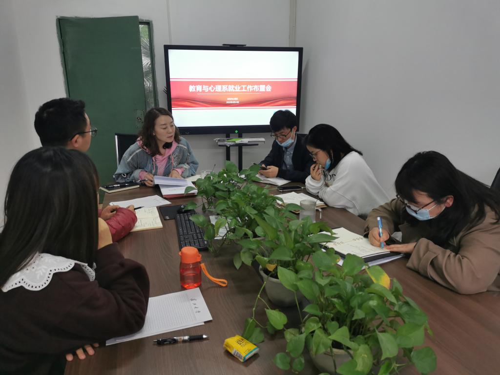本网讯(通讯员 覃儒卿)今天(4月14日)下午,教育与心理系在系会议室召开2018级毕业生就业工作布置会,党总支书记李刚英,系主任徐霄以及就业工作小组7人参会。