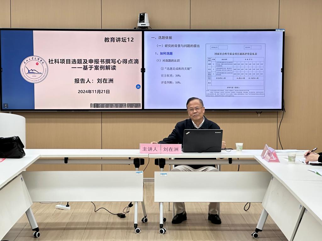 (通讯员 图/刘娅 文/骆飞莉)11月21日下午3时,刘在洲教授受邀以“社科项目选题及申报书撰写心得点滴一一基于案例解读”为题,在实验楼408教室为公司教师作报告。本次活动由教育与心理公司经理徐霄主持,全体专任教师聆听了讲座。