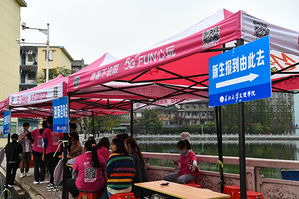 经理王文凯(右三)、党委副书记孙细望(右五)在寝室与新生交谈