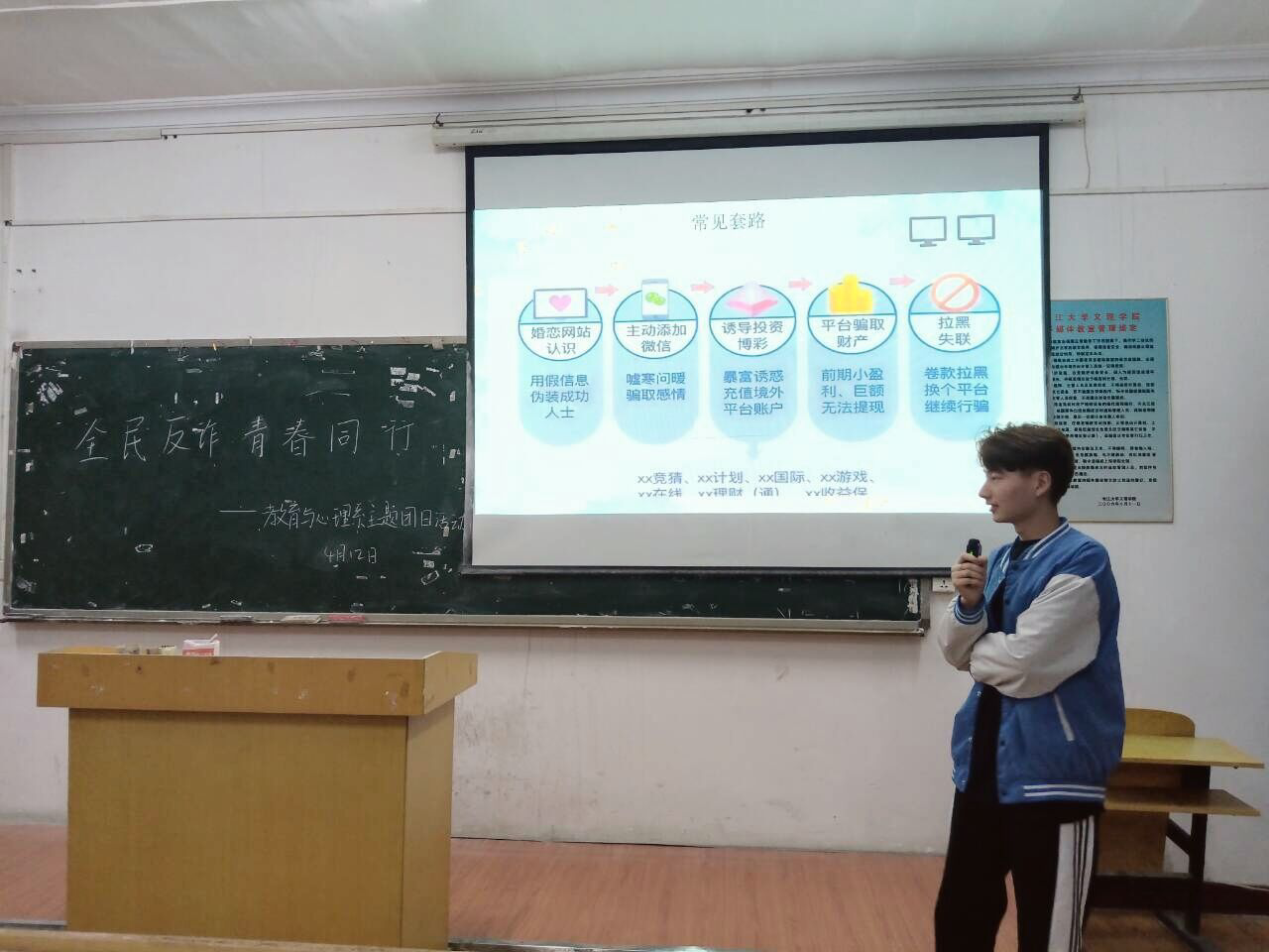 本网讯(通讯员 唐龙玮)4月12日晚,我系在3教308教室开展了“全民反诈,青春同行”的反诈骗主题团日活动,本次活动的宣传人员为微光志愿者服务队之反诈青年团。