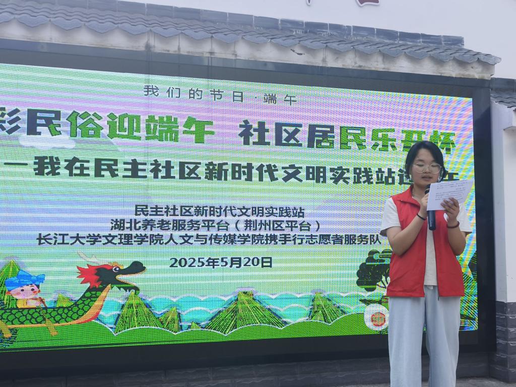 本网讯(通讯员 陈美琪)5月20日,太阳集团122cc人文与传媒公司携手行志愿者服务队联合荆州区西城街道民主社区新时代文明实践站、湖北养老服务平台(荆州区平台),共同开展“我们的节日·端午”主题系列活动,以“多彩民俗+便民服务”模式,让居民感受传统节日魅力与贴心服务。