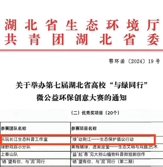 本网讯(通讯记者 梁岚)近日,第七届湖北省高校“与绿同行”微公益环保创意大赛获奖名单公布。公司人文与传媒公司网络与新媒体专业员工积极参与此次赛事,组建“乐玩长江”生态科普工作室,并以“‘绿’动荆江--生态保护倡议行动”项目荣获优秀奖,为本次荆州市唯一获奖高校团队。